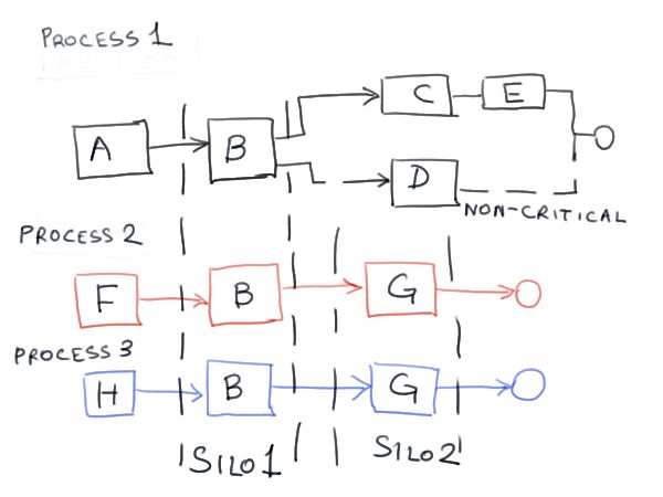 - As long as the underlying business model maintains an ecosystem that generates high, critical demand, silos persist robustly. Small or large changes to individual embedding processes do not affect them because they respond to an internal supply-limited market of many processes. No single-process improvement champion can make a compelling argument for internal change to a silo without understanding the complete demand profile for the silo from all it's client processes.