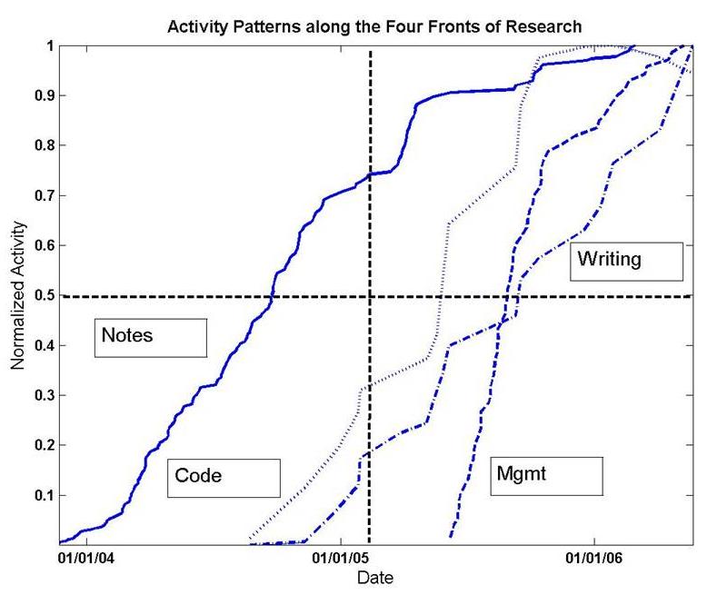 My graph above reflects throughput patterns within my particular style of academic engineering research in modeling and simulation during that particular period (I was a postdoc at Cornell during this time). Coffee at Stella's in College Town got transformed into written notes. Notes got transformed, in this case, into computer code with which I ran experiments, which produced data files. The data then got transformed to research output documents (papers and presentations). Here's how I measured this throughput, each artifact in its own unit, with the cumulative total at the end of the year normalized to 1:
