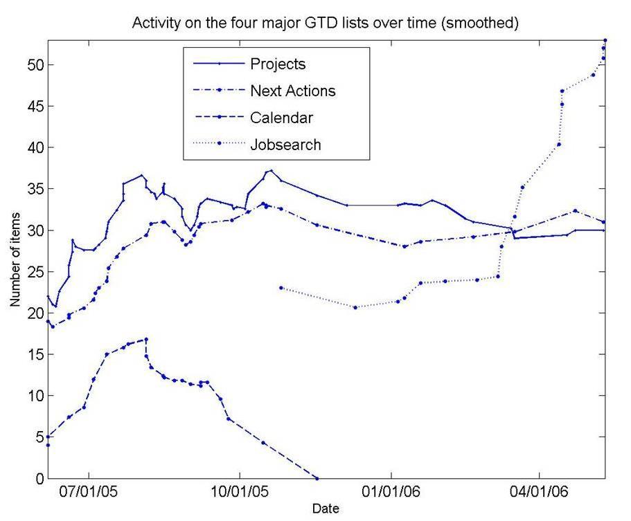 - Note that the activity on both the Next Actions and Projects lists tails off in the second half, but a special list (my Job search list) is very active and growing