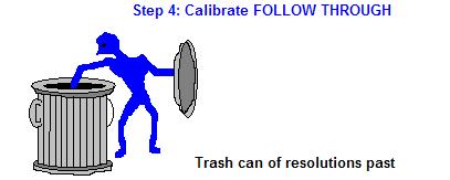 This step generated no new sheets of paper. Put your sheets back into the manila folder. Step 4: Calibrate your FOLLOW-THROUGH Unless you are a completely flaky moron or a certifiable obsessive-compulsive, you probably have good follow-through in some areas, bad follow-through in others. If you want an easy-wins year, you'll want to pick resolutions in your strong follow-through areas. If you are up for a challenge, you'll take on resolutions that involve behavioral challenges. You need to know which is which.