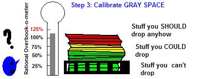 Advanced tip: if you use a more sophisticated system like GTD (David Allen's "Getting Things Done"), you may want to attempt a more comprehensive mind-sweep and update of your GTD lists, and recalibrate the way I described in my article How to measure information work. If you are good at the GTD sweep, you'll capture more than amateurs will, and end up with a seriously cathartic 50-70 item list. For GTD'ers, Momentum is really just a subset of the 'Projects' list. Put this list in your manila folder. Step 3: Calibrate GRAY SPACE You have all the spare bandwidth to execute on your intentions right? Yeah, right. If you are normal, you are already overbooked for 2009, and this is a good thing, as I have argued before. As Parkinson's law says, work expands to fill the resources available, and you are currently in this state. The bad news is this: there is no obvious "spare" whitespace time in 2009 for you to fill in with execution of noble resolutions ("June-July: write novel" anyone?). The good news is that there is plenty of gray-space stuff. Stuff that expanded because you were dumb enough to let it. Stuff that can be delegated, dropped, wriggled-out-of, scaled down, simplified or superseded by a higher priority. You can trash-compact your way back to some serious available bandwidth if you are bloody-minded enough.