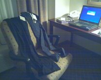 Serendipity strikes. I've been using a single pair of ratty and torn pajamas for a while, and as a new cloudworker, I've been idly meaning to get myself not one, but several nice new pairs of pajamas to work in. For some reason, I can't seem to find any I like in DC. Here, at Target, I find a sale going on and a bunch I like. I buy 2. So my forgotten pajamas help me recognize and cross off a task I didn't even know I had on my list. I buy them, and a coffee, and head back to the hotel. Here they are, draped over my chair near my temporary hotel-room desk.