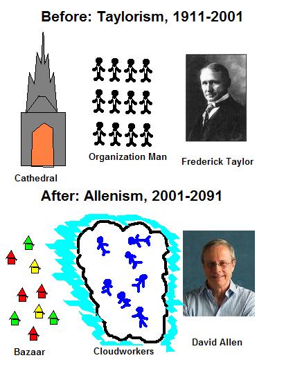 Here's the short, illustrated version. In 1911, Frederick Taylor invented the management model of Taylorism, which became the operating system of the The Cathedral, where the Organization Man was born, with William Whyte becoming his biographer. Six Sigma is the last hurrah of Taylorism. Ninety years later, In 2001, David Allen, with Getting Things Done, created Allenism. A model of work that is well on its way to becoming the operating system for the antithesis of the Cathedral, The Bazaar, home of the Cloudworker, whose biographer is undoubtedly Dan Pink (I just came up with the word, Dan's written three books about cloudworkers). Eric S. Raymond, who wrote The Cathedral and the Bazaar about the open source movement, billed himself an accidental revolutionary. I am more modest. I'll call myself the accidental wannabe-word-coiner, and hope that 'cloudworker' at least merits a footnote in the history of work. Anyway, here's my picture explanation of Allenism vs. Taylorism:
