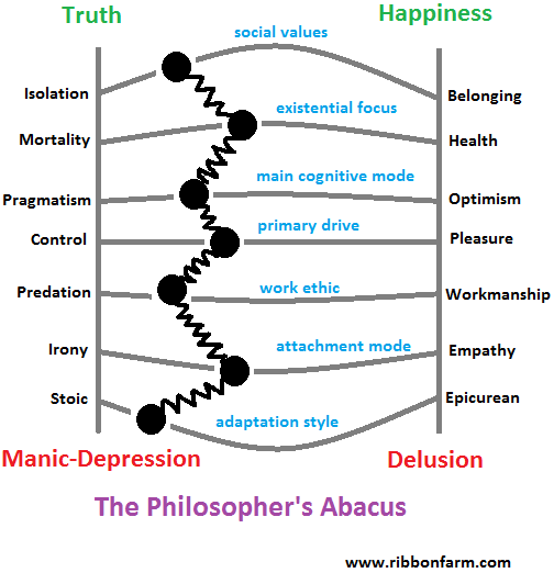 Where does the abacus come from? I believe it comes from genetics. Darwinism manifests itself in human behavior as an uneasy balance between our social natures and our competitive natures. Everything we do comes down to it. Genetics even drives our philosophical imagination. I know a lot of you will itch to challenge both this foundational premise and the specific ideas I have baked into the abacus visualization. The idea that truth and happiness are fundamentally opposed, and that happiness rests on a foundation of delusion, is a position that a lot of people will strongly object to. But let's not have that argument on the Ribbonfarm birthday week, okay? I have written, and continue to write, in defense of this picture. This whole blog is in a sense an ongoing defense of this picture. So we can continue the arguments as we go along (the next Gervais Principle piece is going to be about this stuff in particular).