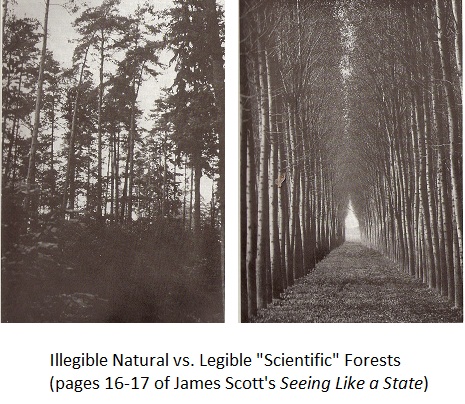 James C. Scott's fascinating and seminal book, Seeing Like a State: How Certain Schemes to Improve the Human Condition Have Failed, examines how, across dozens of domains, ranging from agriculture and forestry, to urban planning and census-taking, a very predictable failure pattern keeps recurring. The pictures below, from the book (used with permission from the author) graphically and literally illustrate the central concept in this failure pattern, an idea called "legibility."