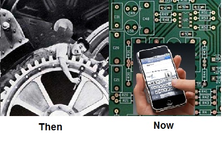 "Oh no, I actually read stuff, not just tweet" you say? Well, my friend @amitseshan has a hardware, chip-level metaphor for you too: he classifies people as long-buffer (people like you and me who read and write 2000 word posts), and short-buffer (people who add value primarily by quickly scanning and passing links along strong and well-curated social networks). Feeling dehumanized yet? And you thought social media was going to let you truly express your humanity. And if you want to find the perfect expression of this "embedded humans" architecture, look no further than Mechanical Turk and Demand Media. There is no better illustration of power migrating into the technology, with humans being mere electronic parts. The industrial age had its indelible image of Charlie Chaplin literally becoming caught in in a gear train in Modern Times. That's what humans as "cogs" meant. The image today is someone furiously RT'ing links on their iPhone. Here's my bad attempt at capturing history repeating itself: