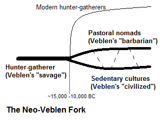 My treatment also differs from Veblen's in one crucial way: what he views as a linear progression, I view as a forking path with barbarian and civilized branches evolving interdependently and in parallel. Like others thinkers of the 19th century, he also used the metaphor of progression from childlike to adult stages (a sort of "ontogeny recapitulates phyllogeny" idea applied to cultural evolution) to think about the linear model, which I think is fundamentally mistaken (though it persists as a trope in movies and television). So to acknowledge my debt to Veblen while distinguishing my views from his, I am going to call the anchor picture the Neo-Veblen Fork.