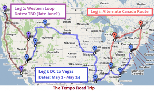It's been quite an insane few weeks, but finally I can cut loose and have some fun with my free agency. Tempo is now on Amazon.com. The early "Stealth Edition" on Lulu has been retired (sorry no more discounts until Amazon decides to offer some; I am doing my best to get the Kindle edition out as soon as possible though). The book site is up and running. I've also put most of my stuff into storage in preparation for a nomadic summer, based out of the Barbarian city of Las Vegas. The main act is a major road trip, spread across two legs, across most of the lower 48 states of the US. Here's the rough map of the route. The first leg of the trip will be DC to Vegas, between next Monday (May 2) and approximately May 24.