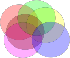 That is what I mean by weak-link hubs being both a personality type and a structural position. You have to have the personality that makes you retreat from centers and you have to have centers around you to retreat from. This retreat is an interesting dynamic. You cannot really be attracted to the edge around a single center, since that is a diffuse place. But if you are retreating simultaneously from multiple centers, you will find yourself a position in the illegible and chaotic intersection lands. Why illegible? Try drawing a random set of overlapping circles and making sense of the pattern of intersections. Here's an example: