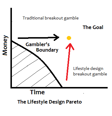 For those of you who are not familiar with the concept, a Pareto frontier represents a tradeoff constraint between two or more variables, time and money in this case. If you are inside the boundary, you can increase both money and time in deterministic ways until you hit the frontier, but if you are on the frontier you can only increase time at the expense of money, and vice versa. There is only one way to break out to the promised land beyond the Gambler's Frontier, where you can have both money and time, and that is to gamble.