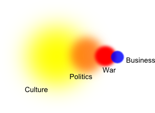 Culture is the most mysterious, illegible and powerful force. It includes such tricky things as race, language and religion. Business, like gravity in physics, is the weakest and most legible: it can be reduced to a few basic rules and principles (comprehensible to high-school students) that govern the structure of the corporate form, and descriptive artifacts like macroeconomic indicators, microeconomic balance sheets, annual reports and stock market numbers.