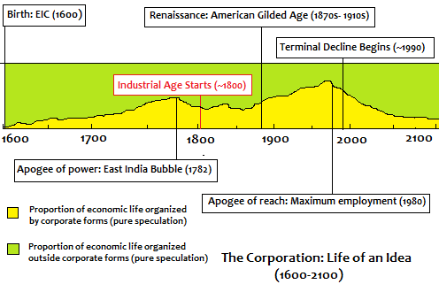 If this sounds eerily familiar, it shouldn't. The year was 1772, exactly 239 years ago today, the apogee of power for the corporation as a business construct. The company was the British East India company (EIC). The bubble that burst was the East India Bubble. Between the founding of the EIC in 1600 and the post-subprime world of 2011, the idea of the corporation was born, matured, over-extended, reined-in, refined, patched, updated, over-extended again, propped-up and finally widely declared to be obsolete. Between 2011 and 2100, it will decline -- hopefully gracefully -- into a well-behaved retiree on the economic scene.