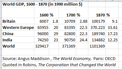 Chinese and Indian jingoists in particular, are prone to misreading this table as evidence that colonization "stole" wealth from Asia (the collapse of GDP share for China and India actually went much further, into the low single digits, in the 20th century). The claim of GDP theft is true if you use a zero-sum Mercantilist frame of reference (and it is true in a different sense of "steal" that this table does not show).