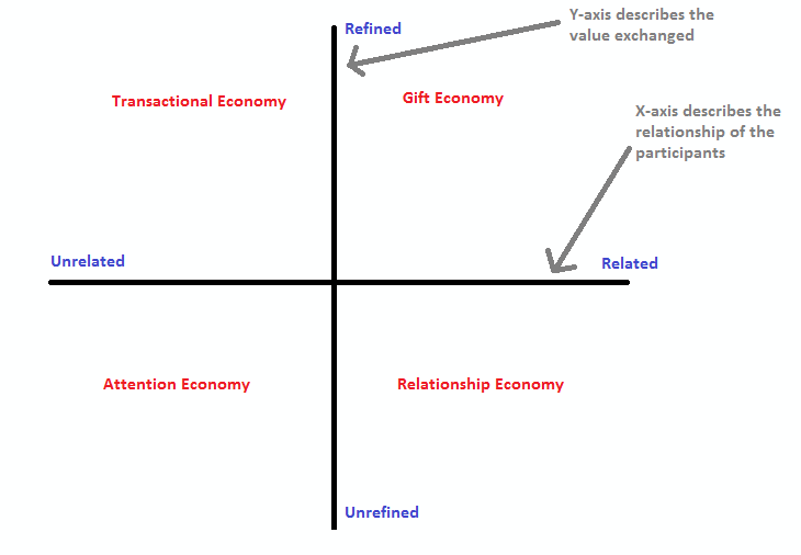I don't normally do straight-up reblogs here, but the new post, Unifying the Value Universe from Greg Rader at onthespiral.com is very relevant to some themes we are starting to attack here. It divides up value exchange into four types of economics: gift, transactional, relationship and attention that can be neatly arranged in a 2x2. As with any 2x2, the identification of the axis variables to use is key, and I think the ones Greg has picked really might be the right ones: relatedness of the parties and refinement of the value-add being exchanged (in the sense of rough vs. polished). Click on and read. He has a more detailed analysis of how this diagram works and in particular, of transactions that cross quadrant boundaries.