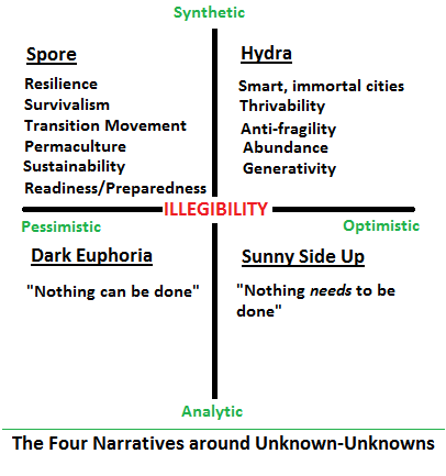 Out of all this scratching, four broad narratives have emerged that can be arranged on a 2x2 with analytic/synthetic on one axis and optimistic/pessimistic on the other. Three are rehashes of older narratives. But the fourth -- the Hydra narrative -- is new. I have labeled it the Hydra narrative after Taleb's metaphor in his explanation of anti-fragility: you cut one head off, two emerge in its place (his book on the subject is due out in October).