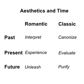 A word of warning: based on a casual online scan I've been underwhelmed by what I've seen written about the two words (romanticism and classicism) by way of definition, so I've gone Humpty-Dumpty and am using the words in ways that make sense to me. I may be reinventing the wheel, repeating mistakes, confusing people who are used to the way a particular academic field uses these words, etc. You can actually use these diagrams to figure out why I think the way I think. Very meta.