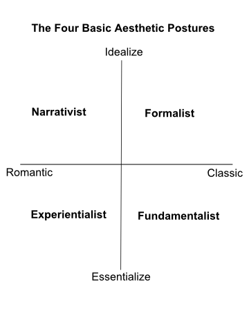 I came up with a similar diagram a while back, though I don't know entirely how I feel about it. I went through a number of axes; but the two that seemed most similar to your own diagram were "Questions/Answers" (romantic/classical) and "Form/Essence" (idealize/essentialize).