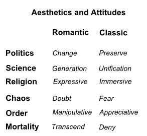 Might the romantic/classic aesthetic be between those who value a thing for the personal, emotional charge it brings vs those who value a thing for the external systemic pleasure that it brings? So, "I love how it makes me feel" vs "I love how this fits neatly into everything else, and helps everything else make sense".