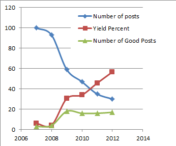 A hit rate of 57% actually understates my sense of finally hitting cruise conditions, because I don't shoot for a 100% hit rate. Only about half my posts are even intended to be relatively polished bets placed in the traffic-futures market. The rest are experimental efforts, posts that are deliberately written primarily for long-time readers, occasional pieces of whimsy, early-release betas, test material for book projects, and so forth.
