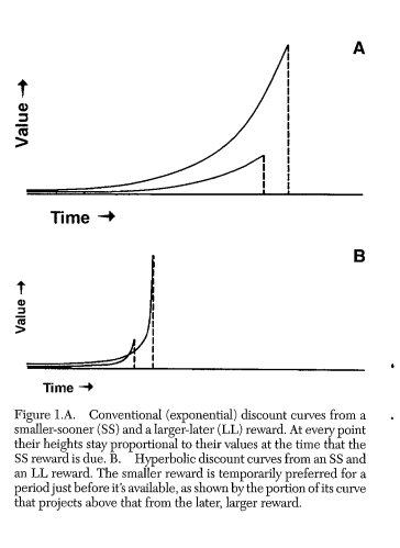 One of the key consequences of hyperbolic discounting is that our preferences can be inconsistent over time. A purely exponential discounter doesn’t have this problem; a temporal graph of perceived utility over time of various exponential reward curves will not have any of them intersecting. But with hyperbolic discounting, short-term goals, when they are imminent, can override longer term ones, or in other words short-term preferences can dominate longer-term ones (figure from Ainslie):