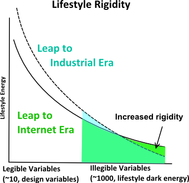 The central feature of lifestyle rigidity (my informal sociological generalization of the idea of wage rigidity) is what we might call dark energy: the lifestyle energy absorbed by parts of your lifestyle that are illegible to you. My claim is that this energy has increased radically in the last century, making the leap from Industrial Age to Internet Age much harder than the leap from Agrarian Age to Industrial Age. As a species, we're carrying a lot more baggage this time around.