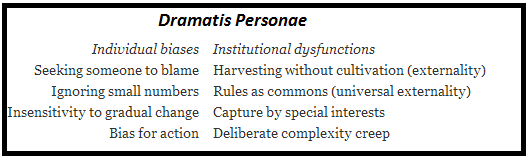 Here at ribbonfarm, Mike Travers last year summarized the arguments against treating people as the only entities with agency, and for instead 'smearing' assumptions of agency to a wider variety of entities as we go about our lives. In this post I want to focus on group agency in particular, and explore how our intellectual limitations and cognitive biases as individuals collectively cause dysfunction in long-lived groups — our institutions. Our modern lives are inextricably bound to juggernauts operating by complex rules, that we seem to inevitably lose control of. Perhaps the problem has something to do with how we construct the rules our groups and institutions operate under, how our individual biases cascade and multiply into institutional decay.