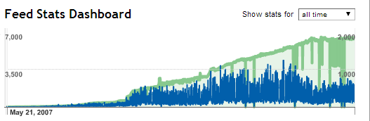 On the other major front, feed statistics have flattened out far more sharply, most likely due to the Great Killing of Google Reader, which I think made a lot of people give up on RSS entirely. Modest gains from something like 5800 to 6400 over the past year in subscriptions, I'd guess, and sharp fall of about 30% in reach as far as I can tell.