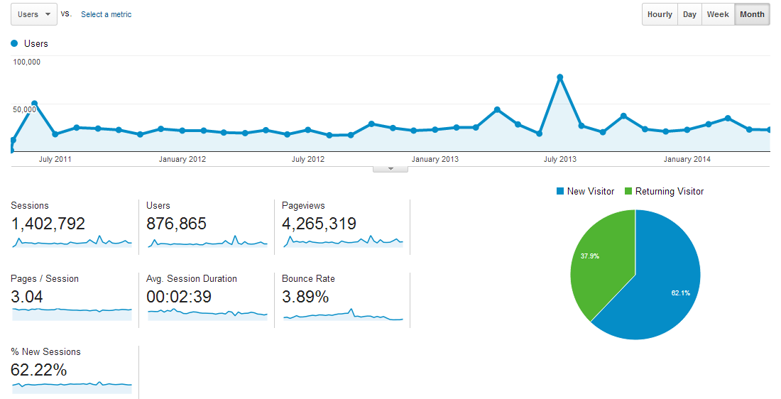 Not much to report there. Roughly comparing June 2013 - May 2014 to June 2012 - May 2013, we see a gain of 333,707-273,731 = 59,976, or a mean gain of just under 5000 additional unique visitors per month. Which is a completely meaningless figure because much of the difference can be attributed to the large transient spikes in a given year.