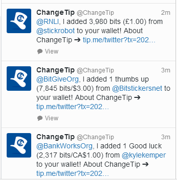 A couple of weeks ago, I was introduced to the bitcoin-based tipping service for Twitter, ChangeTip, by Leslie John Dilley. It is a fascinating thing to experiment with, and you should try it out if you're interested in bitcoin. What makes it particularly interesting is that you can define your own pseudo-currency units called "monikers". The result is a deceptively simple-seeming UX that not only lowers online tipping friction dramatically, but nails the psychology of tipping in a very powerful way. You simply mention who you want to tip in a tweet, and how much (using either a standard unit or a personalized moniker), and cc @ChangeTip. The service then sends out a tweet inviting the recepient to collect. The second tweet looks like this (notice how the 2nd and 3rd examples in the image are using personalized monikers; "bits" in the first one is one of the standard system-wide monikers):