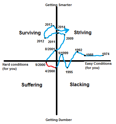 Striving is getting smarter in good conditions. Surviving is getting smarter in bad conditions. Suffering is getting dumber in bad conditions -- a progressive failure to continue existing. Slacking is getting dumber in good conditions. Try drawing your life on this 2x2. Note that equal intervals of time will not map to equal lengths on the path. The trajectory tracks your story of adaptation, not your story of aging. When it comes to adaptation, as Lenin remarked, there are decades where nothing happens and weeks where decades happen.
