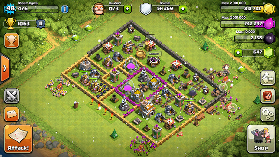 Unlike the other two games, which dissolve the ego into primordial physics and number theory respectively, Clash of Clans aims to amplify the ego by simplifying all the physical and mathematical aspects of reality. Physics is automated -- you deploy troops in attack patterns, but their movements and weapon-wielding behaviors are controlled by the game engine after that. Mathematics is reduced to fairly trivial book-keeping uses -- you greedily count your gold and elixir, and you compare your warriors in terms of offensive and defensive capabilities ("damage" points and "hit points"), but you don't do much puzzle-like mathematical thinking the way you do in Bejeweled. You also don't exercise your hand-eye coordination capabilities the way you do in Smash Hit.