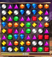 The second game I played a lot was the equally popular Bejeweled Blitz. The game involves swapping neighboring gems on a board to create patterns that destroy them. The simplest is a line of three gems that causes all three to disappear. More complex patterns create special gems, and swapping those special gems causes more destruction.