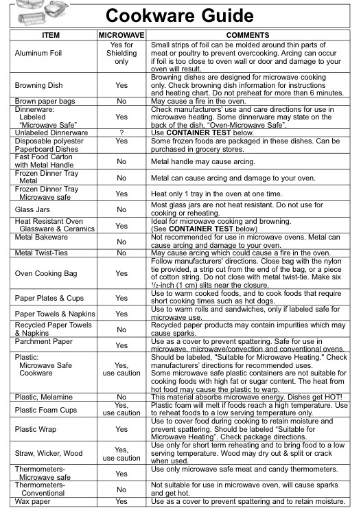 A few pages into the manual is a table to assist with food preparation, listing the appropriate kinds of cookware for use in this microwave: