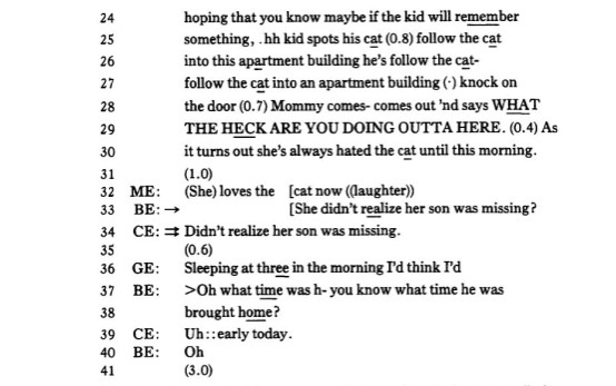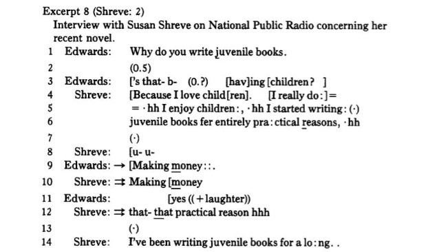 I am hesitant to assign 60-page papers to my readers, but Schlegoff's examples hold a great deal of value and make the phenomenon crystal clear. For instance, here is a typical exchange demonstrating the phenomenon, one of a couple dozen presented in the text (I quote them in image form because of the difficulty of transcribing the exchange):