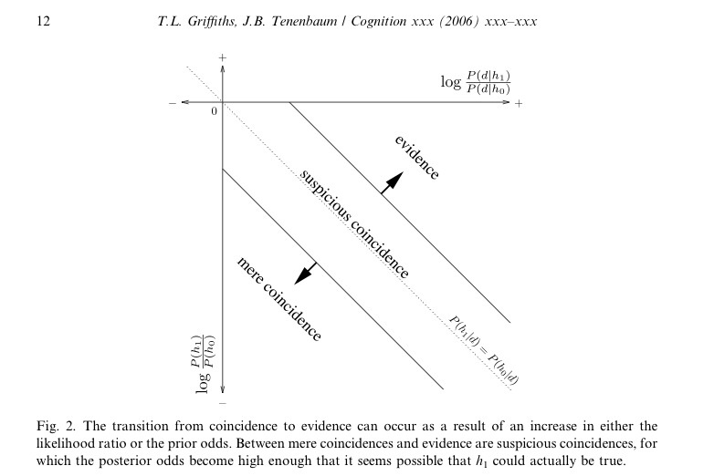 In "From mere coincidences to meaningful discoveries," Thomas Griffiths and Joshua Tenenbaum argue that while the perception of coincidence is often epistemic error, the same phenomenon underlies our ability to understand the world at all. Coincidences, they say, "are not just unlikely events, but rather events that are less likely under our currently favored theory of how the world works than under an alternative theory." They are an invitation to possibly change beliefs - the perception of a pattern in causal space whose existence had not been suspected before. A "mere coincidence" provides very weak evidence or supports a theory that is very unlikely according to evidence other than the coincidence. A new theory will not be adopted based on a "mere coincidence." A "suspicious coincidence," however, provides somewhat stronger evidence, or supports a more plausible hypothesis. The old, pre-existing theory and the new theory are rendered about equally likely by a "suspicious coincidence." And when a new theory is very plausible, or when the event supplies very strong evidence for it, it is not called a coincidence at all, but rather "evidence." The continuum is illustrated in a beautiful graphical and mathematical compression: