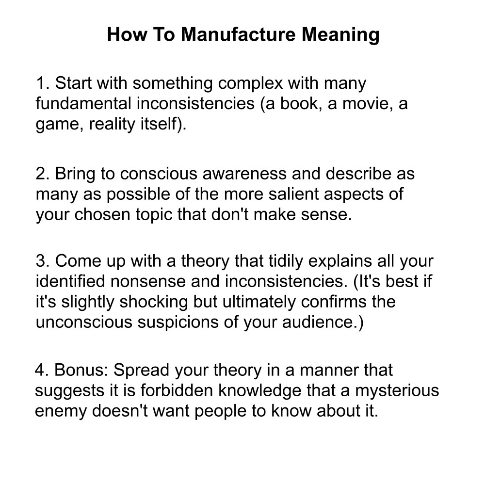 There are intrinsic statistics to our knowledge. When something is unlikely, we don't calculate the statistics - we simply know (or, rather, feel) that it is unlikely. The statistics have been precalculated for us, in our experience with the world such that our knowledge reflects the likelihood of events, and when these likelihoods are contradicted we are surprised.Surprise is an essential feature of coincidence. Surprising phenomena are the most fertile grounds for adapting our models of the universe; surprise is even "believed to be a trigger for associative learning." An entity that cannot be surprised cannot learn, because its model of the universe is already so perfect that it cannot be improved. Surprise also often triggers the suspicion that someone is playing a joke on us (Hurley et al., p. 243). Positing a mind, with intention, behind suspicious happenings is sometimes an unavoidable inference, even if it is seen to be ridiculous immediately after being perceived. Hurley et al. note that for children, the world really is run by an inscrutable conspiracy of powerful beings: adults. The error of attributing intention where none exists is often incorrect, but it's so often and importantly correct that our cognitive architecture has deemed it worth the risk to get false positives. And some of the potential false positives, in the form of gods and spirits, may have value orthogonal to their actual existence, providing a locus of coordination, among other benefits. A good coincidence is eerie, arousing wonder and a sense of the uncanny, because it points to a missing causation where none was suspected to be. Often the missing causation can be filled in by an entity with agency, as described in the previous paragraph - a ghost, fairy, or god meddling in worldly affairs. But just as often the missing causation is left empty, not explicitly accounted for. "Dark Side of the Rainbow" is made of many surprising coincidences, but you can appreciate them with wonder without proposing any particular reason for their existence. Similarly, older versions of the Book of Mark in the New Testament end abruptly at the discovery of Jesus' empty tomb; the ambiguity is not explicitly resolved, and the uncanny, unlikely coincidence is left unexplained. The book ends merely by noting that the witnesses were afraid. The later-added ending of Mark can be regarded as a fan theory resolving the ambiguity of the original, resulting in a text that is less ambiguous and, I think, less wondrous. Ambiguity and Incongruity Now we have some idea of the roles of humor and coincidence in cognition, so we can turn to fan theories. Fan theories are produced by approaching items of culture as if they were puzzles, secret communications to be decoded and solved. Fan theories, silly as they may seem, provide the basis for a model of cognition present in all "serious" human epistemology, from law to science. Solving puzzles from ambiguous subject matter represents an evolutionarily important mode of interacting with reality - especially social reality. This puzzle orientation is consistent with my social model of human consciousness presented in "The Essence of Peopling" - the main puzzle we are always solving is, what do other people have in their minds? Fan theories are successful to the extent that they can find work - just like cognitive concepts. By work, I mean the ways in which a theory interacts with reality, operating on the world and reproducing itself. The germ theory of disease finds work in hand washing and the manufacture of antibiotics. Fan theories about movies find work on internet discussion groups and at the kind of parties where people talk to each other (and, of course, in Room 237). Theories that correspond tightly to reality are often very useful, and find a great deal of work; however, theories that do not have much physical-world relevance are often very competitive if they manage to do social work. Some theories may compete by offering hedonic rewards, which can add to their social transmissibility - that is, they are fun, satisfying, exciting, touching, awe-inspiring, or pleasantly horrifying. Theories that optimize for social transmissibility and reward packages may have to sacrifice other qualities, such as strict correlation to reality, but despite this limitation, they can become very powerful and do a great deal of work in the world. One of the most important features of the source material upon which "fan theories" may be created - what makes them plausibly puzzles - is that they are ambiguous. Visual information, in rich supply in movies such as The Shining, is inherently ambiguous. Language is ambiguous too; words may have multiple denotative meanings, or may be anagrams or numbers (as with my microwave aliens). The sound of words is another source of ambiguity, the ambiguity underlying the humor of puns. The sound of words may be experienced backwards for even more ambiguity, a feature explored in the "backwards Satanic messages" craze of the 1970s and 1980s. (The existence of these backwards messages as well as their purported content constitute an important 20th century fan theory.) The role of ambiguity is preventing any one hypothesis from being so plausible that it crowds out other possible hypotheses, consigning all possible "evidence" to "mere coincidence" territory in the coincidence model above. Fan theories are distinct from humor in that the emotion triggered is not mirth, but something like wonder, insight, or a sense of the uncanny. And with fan theories, there is no obviously correct interpretation to "tumble to." In humor, hidden ambiguity or conflict is exploited for laughs by revealing a faulty assumption; in fan theory, ambiguity is exploited to produce insight or wonder by building a case for a surprising hypothesis, rather than suddenly "tumbling to" an error. Humor is destructive; fan theory is constructive. Fan theories grow best on subject matter that does not have
