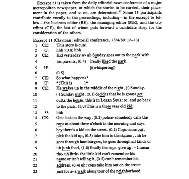 In the above example, "making money" is the repeated phrase, the solution to the allusive "puzzle" presented by the euphemistic "practical reasons." In another case, in a newsroom, an editor (the city editor, "CE") presents a potential story to the staff: