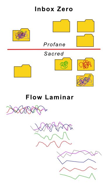 Stream workflows do not create artificial barriers between sacred and profane. By retaining temporal structure and resisting the urge to treat bits like atoms that can be moved around between buckets, they keep chaos front-and-center at all times, and don't allow you to delude yourself that moving from Inbox to misc and pretend you've gotten "organized." They also don't try to force fit deterministic expectations on probabilistic phenomena. Most importantly, the make it difficult or impossible to create growing misc zones of denial.