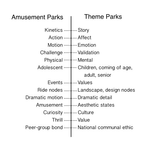 A host of planners and architects have been awestruck by his untutored populist designs, believing, in postmodernist Robert Venturi's words, that Walt's whimsical places are "nearer to what people really want than anything architects have ever given them." As early as 1963, the noted planner James Rouse told a shocked Harvard School of Design audience that "the greatest piece of urban design in the United States today is Disneyland" and admonished them to realize that "in its respect for people, in its functioning for people" Disneyland contains more positive planning lessons "than in any other single piece of physical development in the country."And a big part of what people want, apparently, is immersive narrative connection to the only myth of origin they can connect to, that of the frontier. And the mythical frontier belongs to everyone, not just Americans. If Disneyland is the canonical theme park, then Six Flags is the canonical amusement park: focused on kinetic rides, lacking narrative detail and structure, providing distraction and amusement rather than values-laden, focused entertainment. To distinguish amusement parks from theme parks is not to judge amusement parks as bad or wanting; they are simply a different and distinct phenomenon from theme parks. Margaret King offers these criteria to contrast the two: [caption id="attachment_5090" align="alignnone" width="500"]