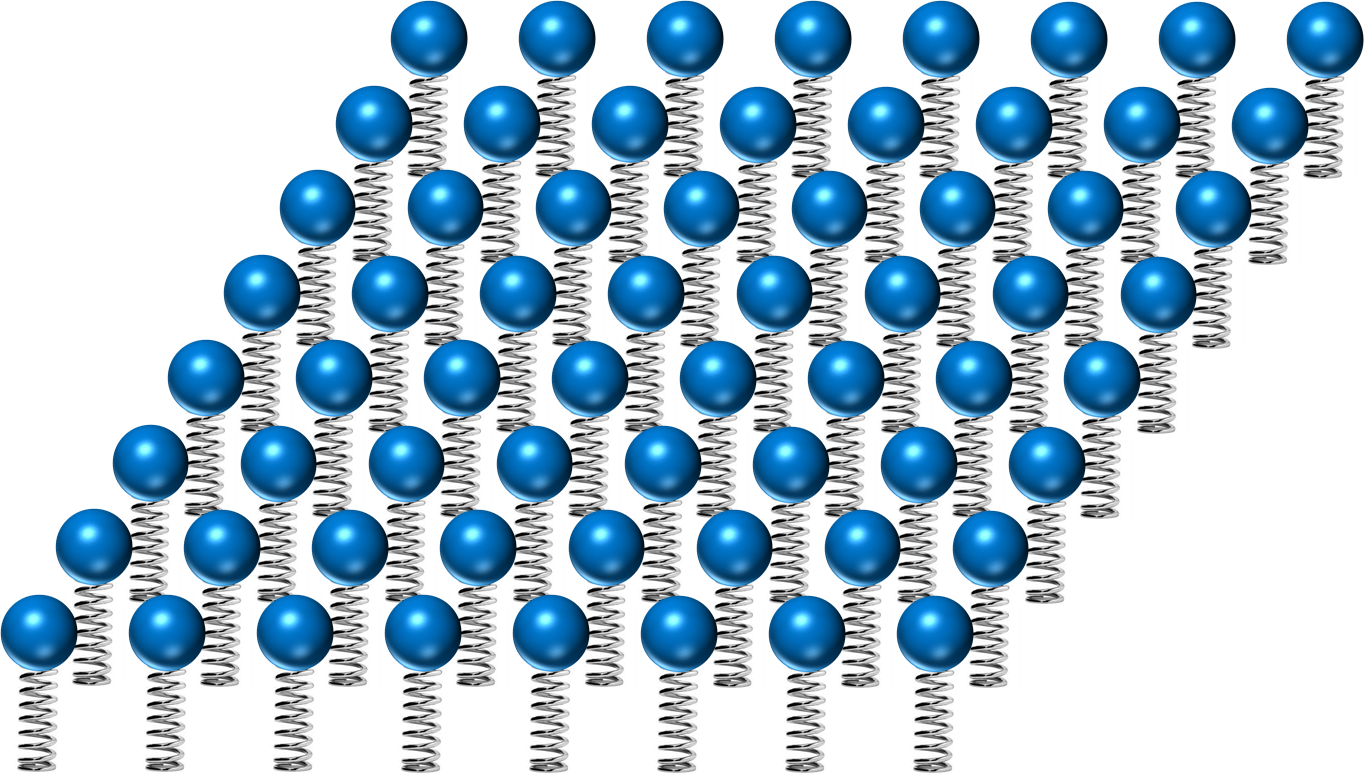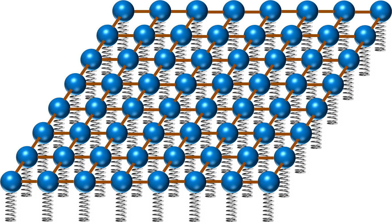 In the picture above, the array of balls-and-springs is pretty uninteresting: each ball is either stationary or bobs up and down independently of all others. In order to make this array into a bona fide field, one needs to introduce some kind of coupling between the balls. So, let’s imagine adding little elastic bands between them: