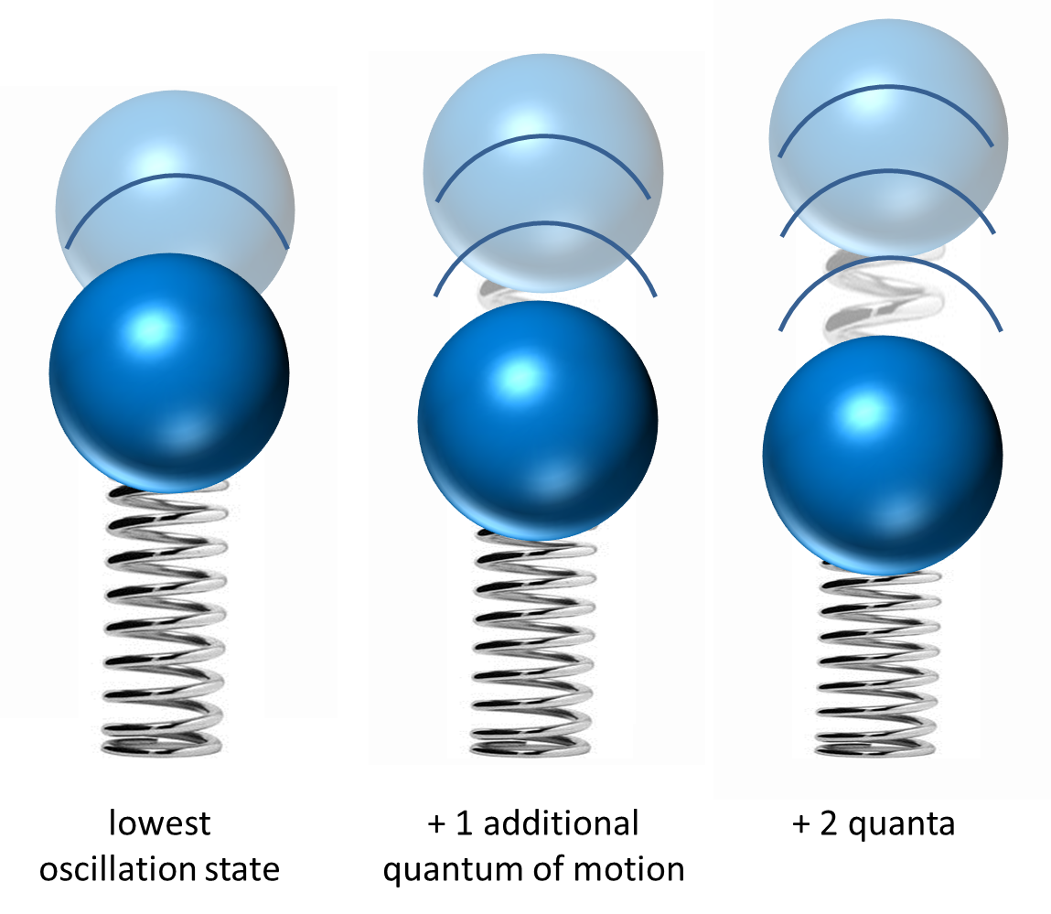 To fix this problem, we need to consider that the individual constituents of the field – the balls mounted on springs – are themselves subject to the laws of quantum mechanics. A full accounting of the laws of quantum mechanics can take some time, but for the present pictorial discussion, all you really need to know is that a quantum ball on a spring has two rules that it must follow. 1) It can never stop moving, but instead must be in a constant state of bobbing up and down. 2) The amplitude of the bobbing motion can only take certain discrete values.