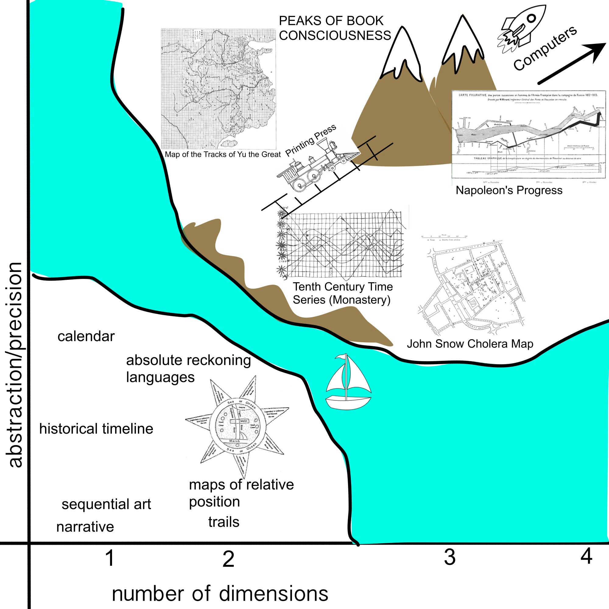 The axes are the number of dimensions represented by the map and the level of abstraction and precision achieved. In this modest map, I have attempted to do more than plot the positions of the different maps, but to indicate their relationship. Narratives, calendars, and histories are maps of time in one dimension. Sequential art (early comic books, you might say) are similar to later, more abstract time series, but lack precise dimensions, illustrating narrative causality instead.