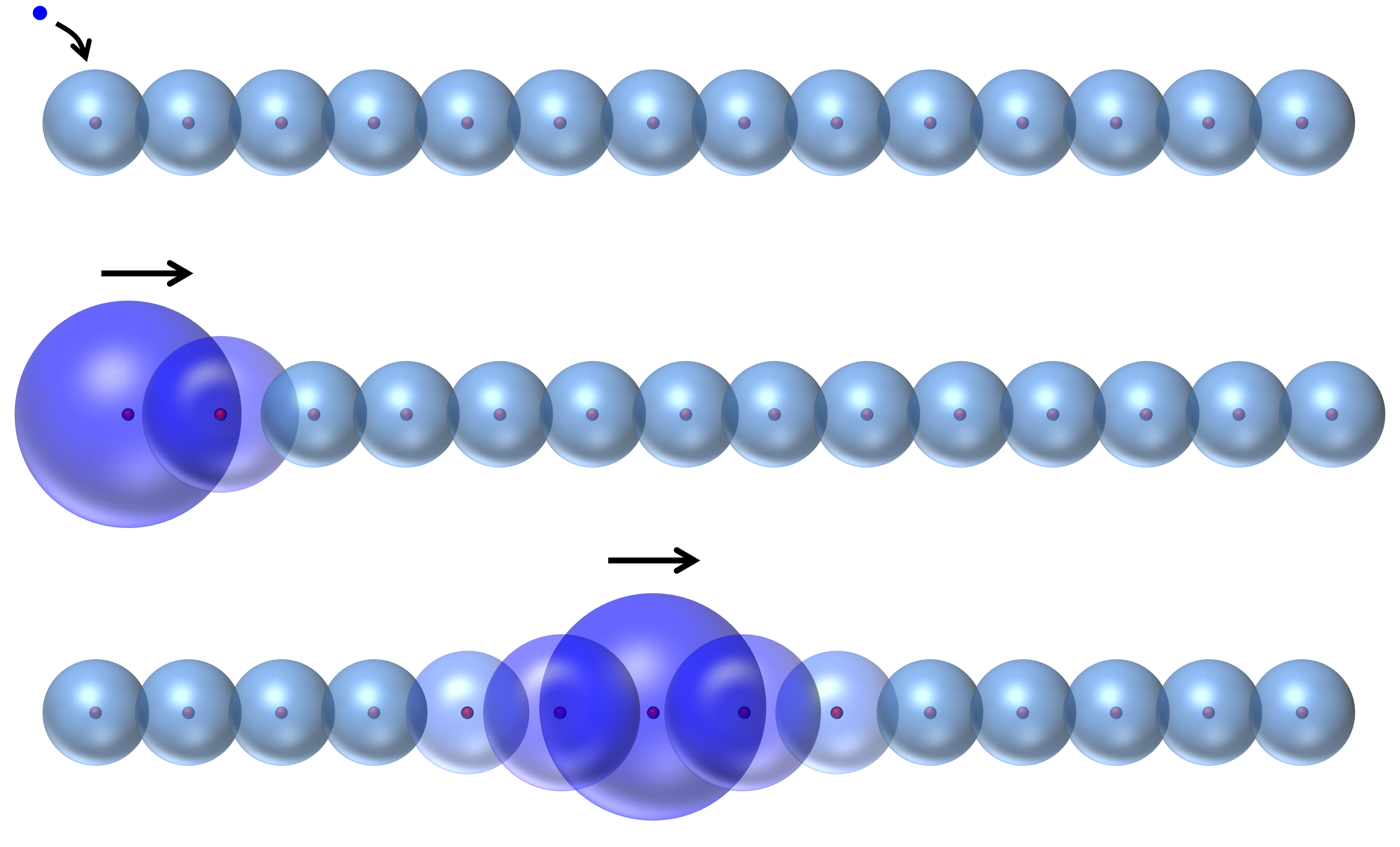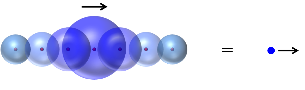 But the emergent wave, that so-called “electron”, is startling in its simplicity. It moves through the crystal in straight lines and with a constant speed, like a ghost that can travel through walls. It carries with it the exact same charge as a single electron (and the exact same quantum-mechanical spin). It has the same type of kinetic energy, [latex]KE = \frac{1}{2} mv^2[/latex], and for all the world behaves like a naked electron moving through empty space. In fact, the only way you could tell, from a distance, that the “electron” is not really an electron, is that its mass is different. The “electron” that emerges from the sea of chaotic electrons feels either a bit heavier, or a bit lighter, than a bare electron. (And sometimes it as much as 100 times heavier or lighter, depending on the details of the atomic orbitals and the atom spacing.)