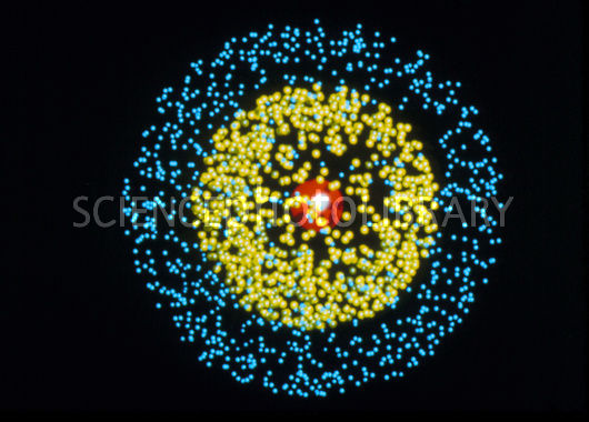 Those points are meant to show the probability density for the electrons inside the atom. Two of the electrons (the yellow points) are closely bound to the nucleus, while the third (blue points) is more loosely bound. The exact arrangement of electrons around the nucleus is actually a difficult question, because the three electrons are continually pushing on each other (via very strong electric forces) as they orbit around the nucleus. So the precise structure of even this simple atom does not have an easy solution.
