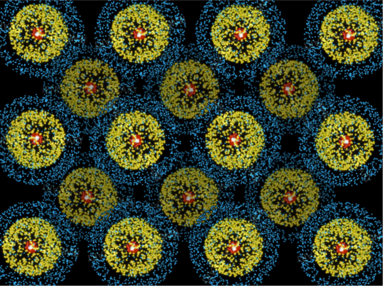 The situation gets exponentially messier, though, when you bring a whole bunch of atoms together to make a block of lithium. Inside that block, the atoms are packed together very tightly, something like this: