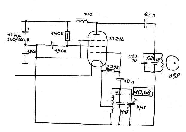 There is a tuned circuit around the bulb of mercury, and an oscillator comprising one pentode tuned to the same frequency. This pumps the loop at 40 MHz. The plasma will burn at a lower frequency, but you need to ignite it first, create enough potential difference inside the bulb by short enough EM waves.