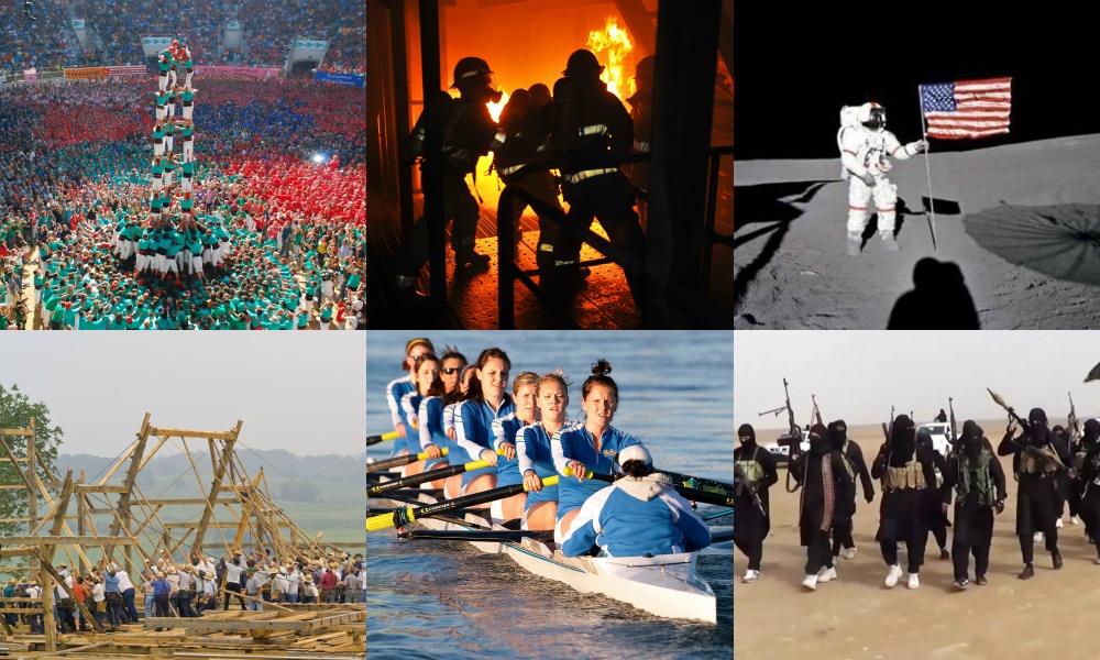 A few superorganisms in action. (Top: human towers of Tarragona, fire department, NASA. Bottom: Amish community, rowing team, ISIS.)[/caption]