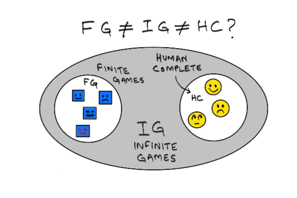 The Human Complete games are also finite, but it is hard to judge while we are human. To make the HC game a finite game, is the very definition of mysticism, occultism, ascension, bodhi, nirvana, etc, i.e. ancient historical claims there are very definite steps that one can take which lead to winning the HC game - and one will eventually take them, because the human scale pleasure and suffering becomes too predictable over many incarnations and hence controllable and eliminated to free a new capability of much finer sensing and gaming.