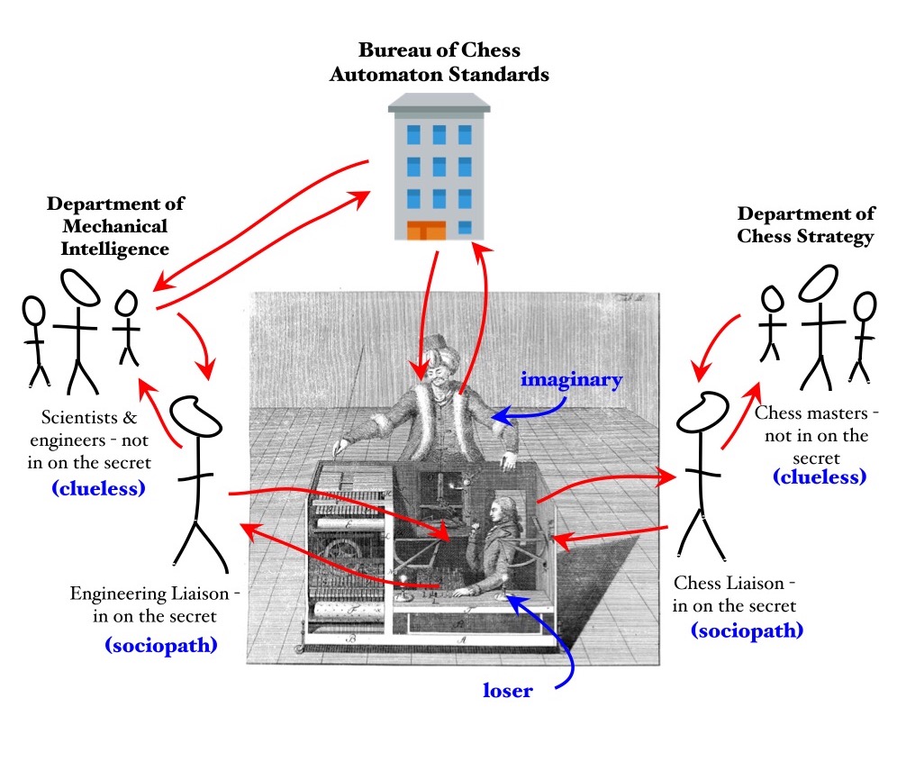 Vienna, late 18th century, alternate timeline. In the beginning, there was just the tinkerer. One night, after attending a magic show at the palace, he got drunk and made a bet with a rival courtier. A few months later, he unveiled a marvelous contraption before a palace audience. The contraption was an automaton, dressed as a Turkish sorcerer. It sat at a desk filled with complicated gears and levers, with a chessboard on top. The Turk played a decent game of chess, beating dukes, princes, and visiting American statesmen. Its reputation spread, and with it the reputation of Vienna as a hub of technological development. Tinkerers from Austria to America set about making their own Mechanical Turks (as well as Mechanical Russians, Yankees, and chess-playing shepherdesses). Only a few succeeded; most were in Vienna. Of those half-dozen that succeeded, all were known to be acquainted with some down-on-his-luck chess master who, incidentally, was not overly tall or rotund. Vienna's reputation continued to spread, and it became fashionable for wealthy patrons to support chess automata and exhibit them. Unfortunately, one of the impoverished chess players got the flu. During his performance, such a loud fit of coughing emanated from his automaton's desk that the audience was scandalized. The Turk, a hoax! The entire reputation of Vienna was on the line. To meet the crisis, the wise Empress created a Bureau of Chess Automaton Standards, and appointed a Secretary of Chess Automaton Quality Assurance to head it. He in turn hired many Chess Automaton Inspectors. But both they and the tinkerers faced a problem: all the chess automata were fake. There was a guy inside playing chess. They could not pass a penetrating inspection. In consultation with the tinkerers, they arrived at a solution that met the needs of all parties. The Automaton Inspectors were taught a ceremonial procedure for verifying the legitimacy of a chess automaton. For the first part, tinkerers were required to present a PowerPoint describing the workings of the automaton to the Automaton Inspectors. The Automaton Inspectors would then perform a cursory inspection of the machine. For the second part, conducted the next day, the Automaton Inspectors would test the chess ability of the automaton to ensure that it had an Elo rating of at least 2000. (This rating would go up a bit every few years, demonstrating the progress of Vienna's mechanical intelligence industry.) Meanwhile, savvy firms added sets of noisy gears to their elaborate-looking apparatuses. The noisy gears had no purpose other than to cover any sound the secreted human operators might unintentionally make. Most of the tinkerers quickly created two new departments: a Department of Mechanical Intelligence, whose job was to maintain and improve the complicated-looking mechanism and explain it to visiting Chess Automaton Inspectors, and a Department of Chess Strategy, whose ostensible job was to continually improve the chess-playing abilities of the automaton to keep up with Bureau standards. The tinkerers (now firms) that did not implement these changes tended to be exposed as frauds, losing their income and status and bringing shame upon their patrons and on Austria. The firms now had an ostensible (narrative or mythic) function, and a real, practical function. The mythical function was to promote the glory of mechanical intelligence - a strategically important myth to Austria's international standing. The practical function was to maintain (and improve) an illusion. These ceremonial inspection practices benefited firms (at least, those who evolved Departments of Mechanical Intelligence and Departments of Chess Strategy) by providing them legitimacy, and benefited the Bureau of Chess Automation Standards by providing income, meaningful-seeming work, and status. However, firms that got on the wrong side of the Empress could be subjected to Extraordinary Review, a more demanding inspection process that necessarily resulted in the scuttling of the false automaton and the disgrace and dissolution of the firm. Many of the scientists and engineers in the various Departments of Mechanical Intelligence did not even know that the automata were not real. Careful precautions were taken to limit the "testing" of the automaton's functionality. The secret was kept by only a few insiders who acted as liaisons between the Departments of Mechanical Intelligence and the clandestine human operators. Sometimes the Departments of Mechanical Intelligence produced real results—quite by accident. One clueless engineer, inspired by his automaton, invented a mechanical weaving machine. Another invented a device that could play voice recordings, enhancing the appeal of the automaton. "Échec!" the automaton would cry. Inspired by the talking machine, an American invented the telephone. The reputation of Vienna was all this time enhanced. However, the Departments of Mechanical Intelligence mostly produced increasingly elaborate mechanisms that didn't do anything, and increasingly elaborate theories about how the mechanism might work, if it did work, which it didn't. Universities began to offer programs in Mechanical Intelligence, with curricula often based on the theories developed in the chess automaton firms. Universities supplied graduates to the firms, professionalized the discipline, and further bolstered the legitimacy of the enterprise. Everyone lived happily ever after. Perhaps they eventually invented the internet, quite by accident. What Institutions Are Up To I have worked in corporations, nonprofit entities, and government agencies. They have always been extremely mysterious to me. I could never quite figure out what the institutions were up to—their goals, workings, and desired behaviors were never clear to me. Mission statements read at meetings seemed to have little connection to the day-to-day activities we performed. What did they want? What were they doing? I will share here a 