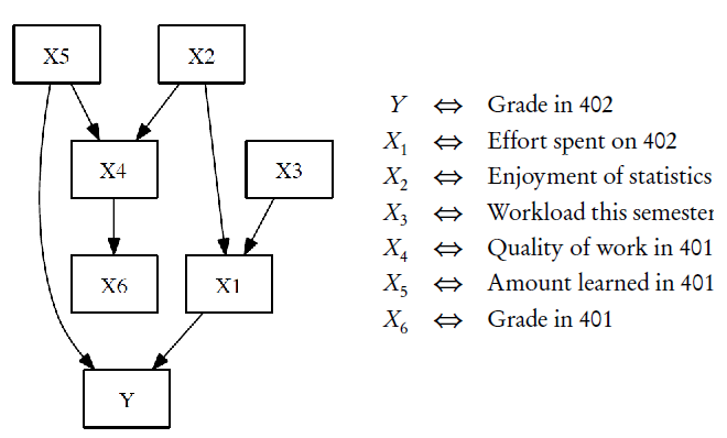 Students in the statistics major take several classes at CMU, among them, 401 and 402. The example illustrates how the grades in the 402 class as caused by the relationship of various factors. These relationships can be direct, connected by an arrow, or indirect, only connected by a chain of other nodes. As an example, someone’s grade in 402, Y, is related to their grade in the previous class (X6), as is how much they like statistics (X2) — but the connection is only indirect. For example, (X6) reflects their effort in that class, which learning impacts directly. Next, having learned the prerequisite material (X5) directly affects your grade in the next class (Y); you can’t understand the new material without it.
